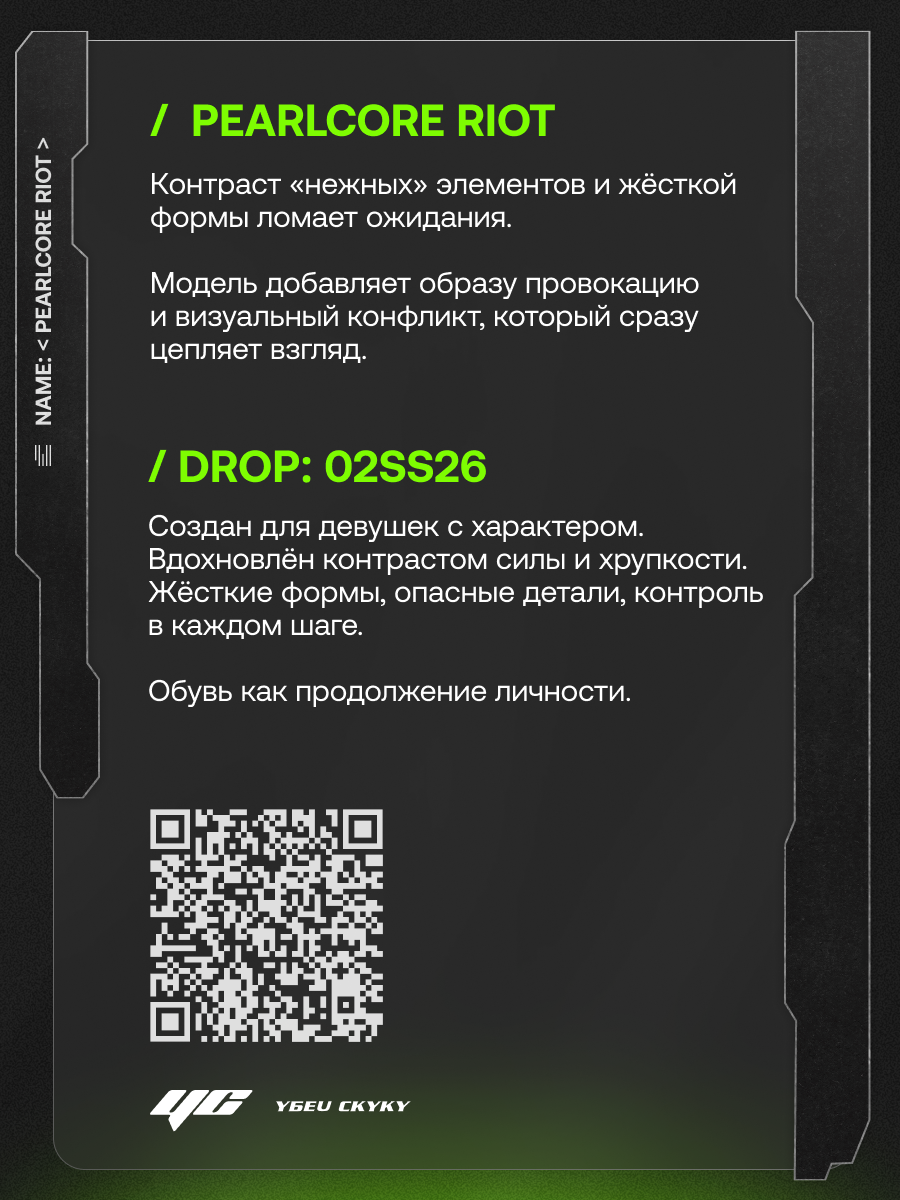Pearlcore Riot Контраст «нежных» элементов и жёсткой формы ломает ожидания. Модель добавляет образу провокацию и визуальный конфликт, который сразу цепляет взгляд.