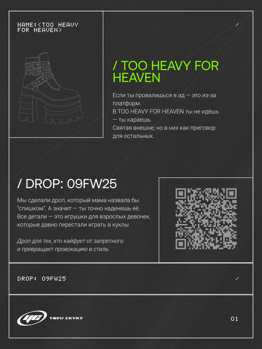 TOO HEAVY FOR HEAVEN "Если ты провалишься в ад — это из-за платформ. В TOO HEAVY FOR HEAVEN ты не идёшь — ты караешь. Святая внешне, но в них как приговор для остальных."